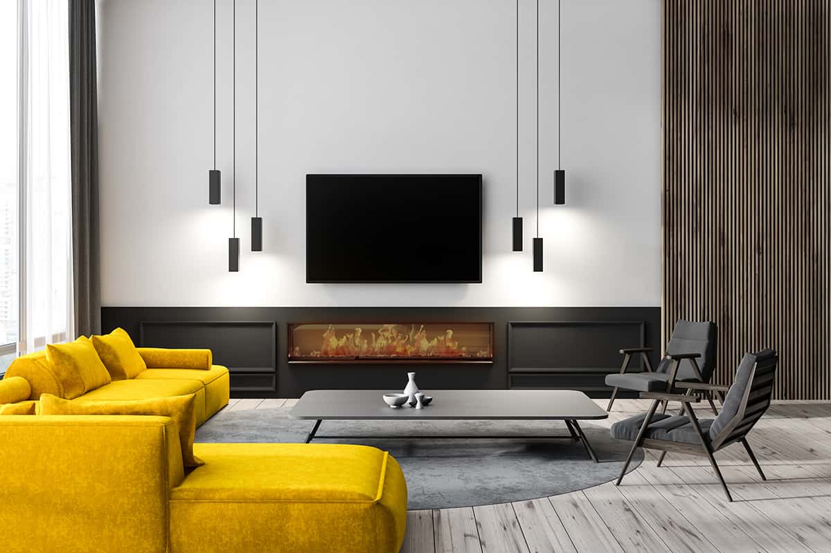 In this example, the elegant hanging lights aren’t pointing outwards, thus making them the best choice for decorating the empty wall. The closed lamps are in chic black just like the TV and cabinet stand. You may prefer to add a row of several lamps above the TV, or use suspended ones on either side of the TV.