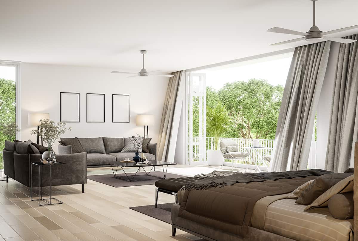 As you can see here, the modern-style master bedroom has ample space to fill it up with several seating furniture facing toward the window. This layout is also perfect for studio apartments in which the bedroom and living room are together in the same space.