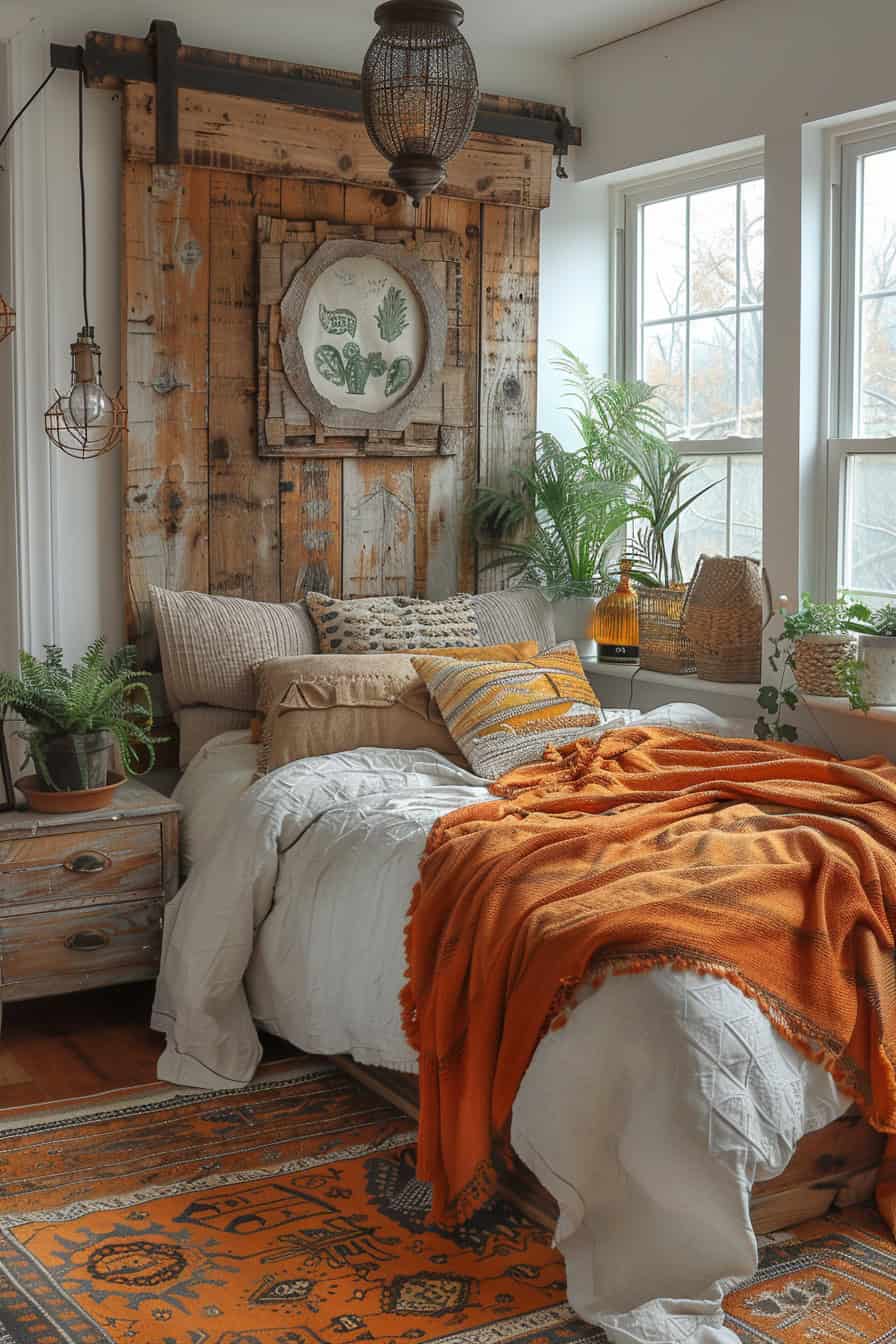 Reclaimed wood and rustic elements dominate this eco-friendly boho bedroom. Lush green plants and warm orange textiles infuse life and color, creating a cozy, sustainable retreat.