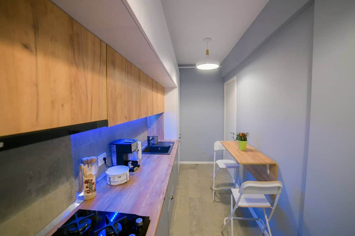 This kitchen is unique in how it lacks any windows. This isn’t usually a good thing since sunlight makes a room feel cheerier. Of course, you can do what this homeowner did and install integrated lights in the form of sconces or LED strips. What we see is a fascinating blue hue coloring the wooden countertop, drawing our attention away from the opposite wall that definitely needs a bit of furnishing.