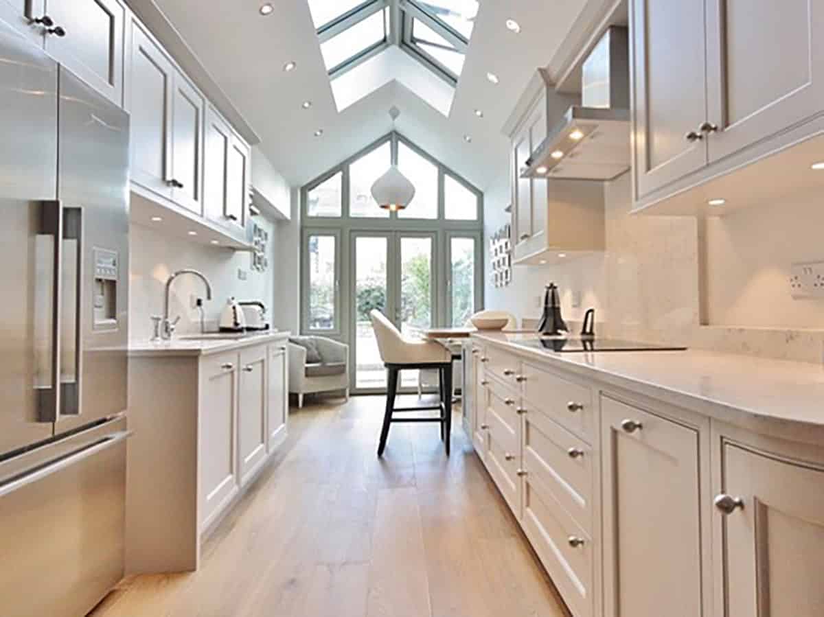 Skylights are a definite benefit if you’re designing a galley kitchen. You may not have the wall space to install a window, but if you have angled ceilings, such as the home in this picture, then you’re in luck. Add the abundance of sunlight coming from the opposite end of the kitchen, and you’ve got a room that sparkles all day long.