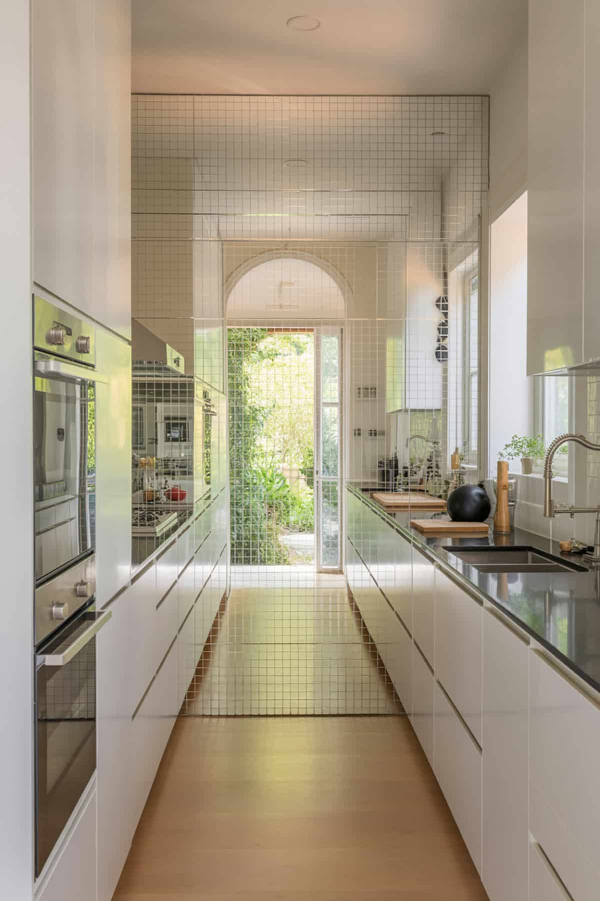 A wall of mirror tiles covers the backsplash behind the counters and cabinets. This design bounces light around the kitchen and shows off garden views in the reflection. The kitchen feels larger and brighter, and the symmetry of the room creates a modern, clean impression.