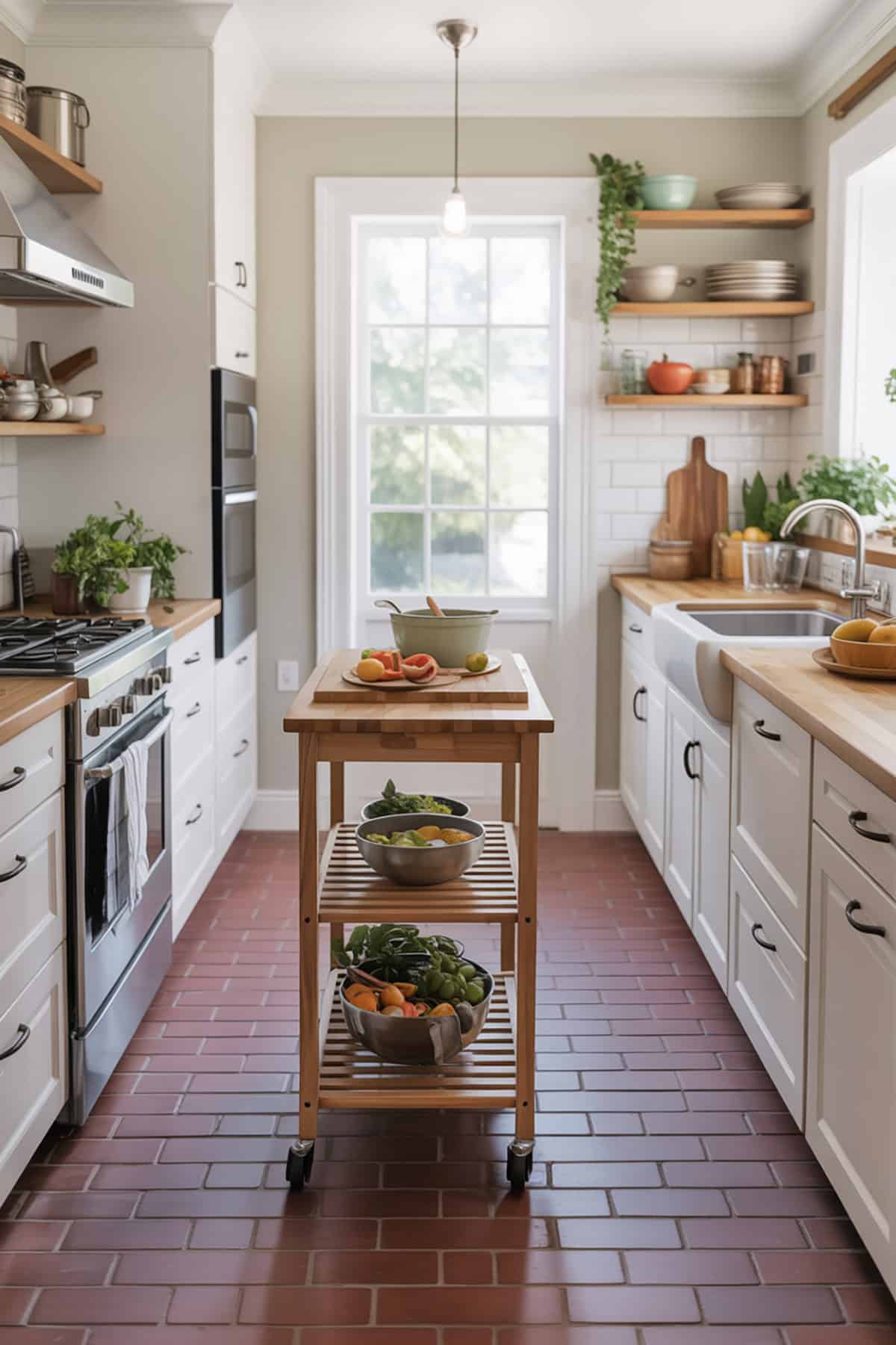 A rolling island at the center supplies extra work space and convenient storage for food or utensils. The island fits comfortably in the narrow room and supports a wide range of kitchen activities. Red tiles on the floor add rustic style and make the kitchen stand out.