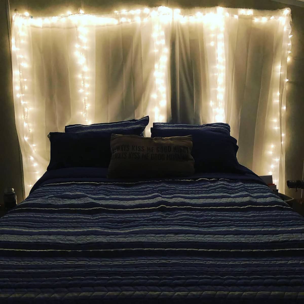 Here’s something everyone—especially kids—can enjoy! To add a bit of liveliness to this bedroom, the homeowner went with hundreds of individual lightbulbs in the backdrop. The bulbs are fastened onto a hanging curtain, which is lighter in tone compared to the layered bedding. This design has a more casual, DIY-friendly feel to it, but as it is, it undoubtedly has potential for a romantic vibe.