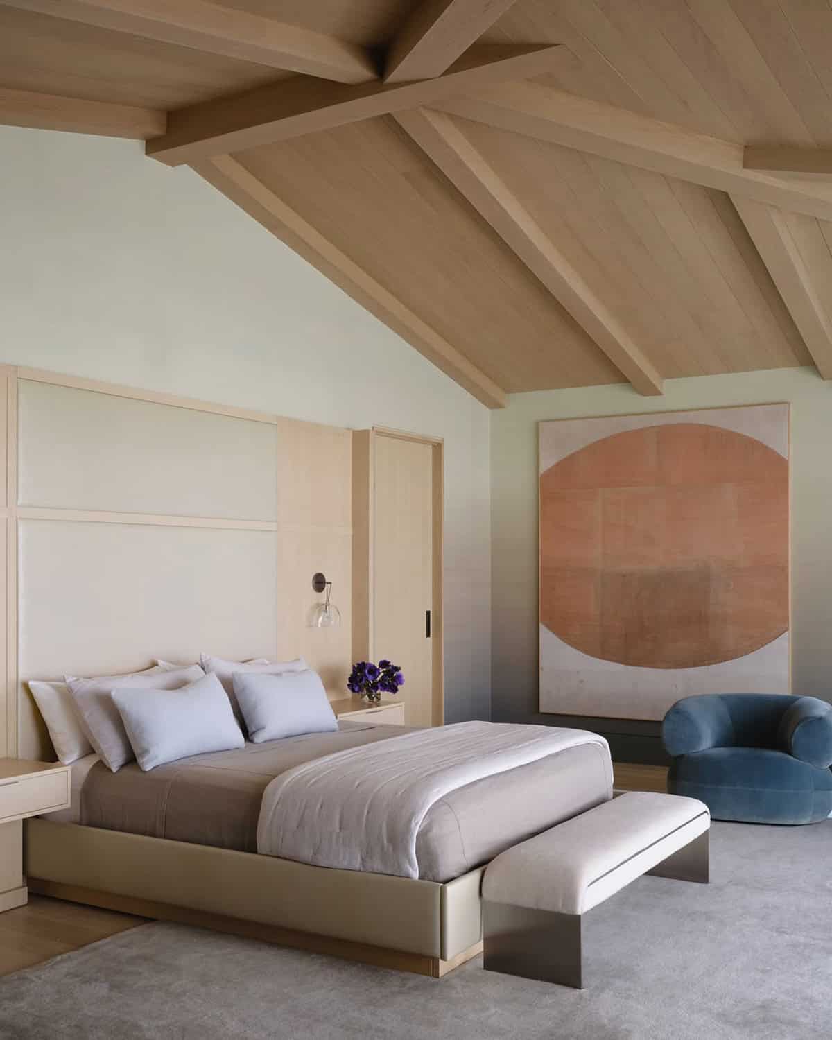 This is a room that screams “natural color palette.” The muted tones contribute to an uncluttered atmosphere, but the main attraction is the large wall panel that’s integrated with closets on either side. The panel is a canvas that the homeowner can decorate or leave bare to emphasize minimalism.