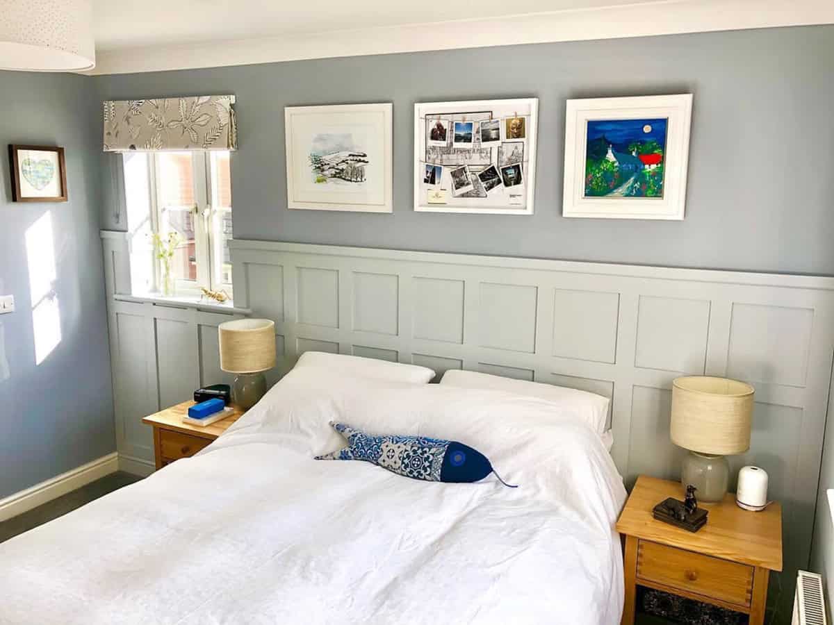Instead of using a headboard, this homeowner came up with integrated paneling that extends the entire width of the wall. The rectangular grid pattern offers a sense of traditional charm, while the color choice complements the muted tones of the rest of the room. The raised panels add dimension to the otherwise 2D surface by casting subtle shadows in the daytime.