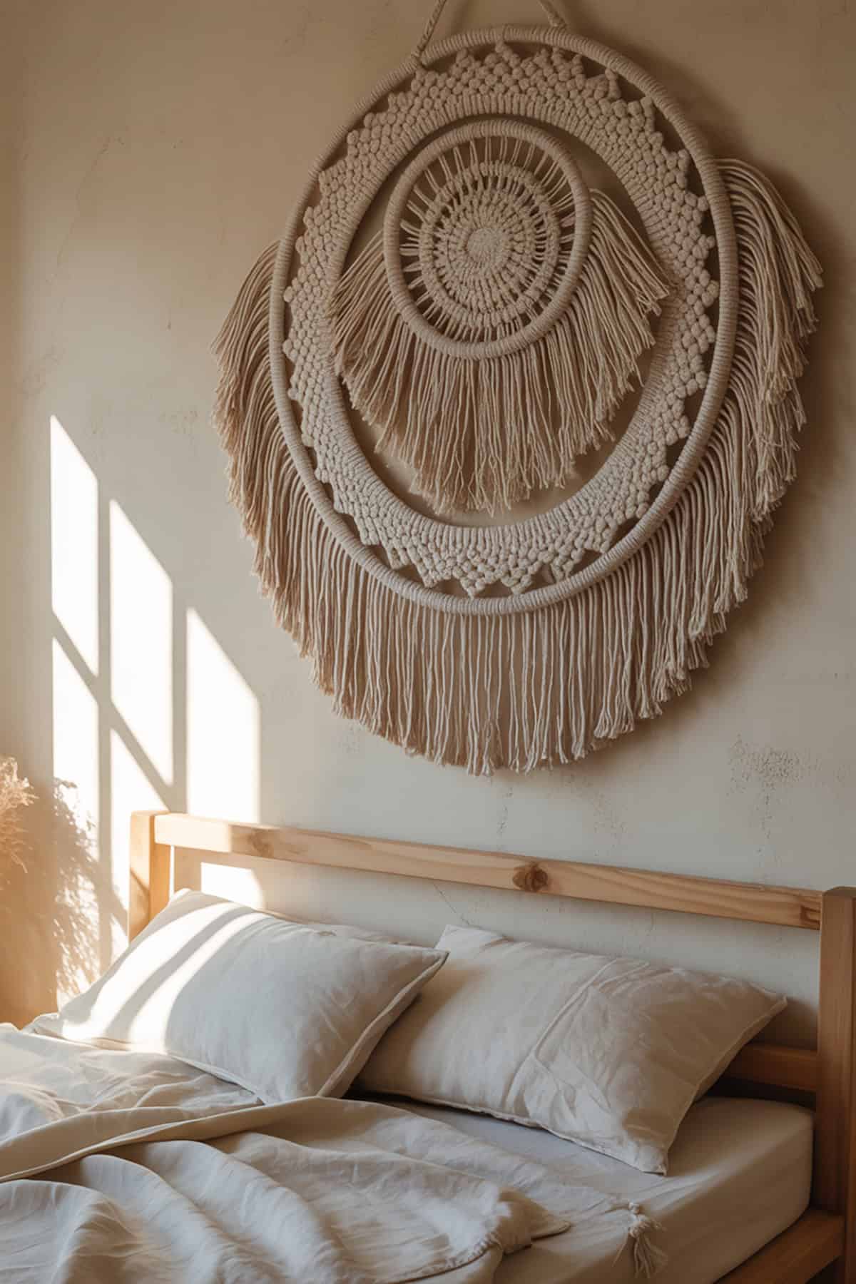 A large macrame piece hangs above the bed and introduces handcrafted detail to the space. The woven textures create a cozy and relaxed mood in the bedroom. The bed feels unique and welcoming, even with no headboard.