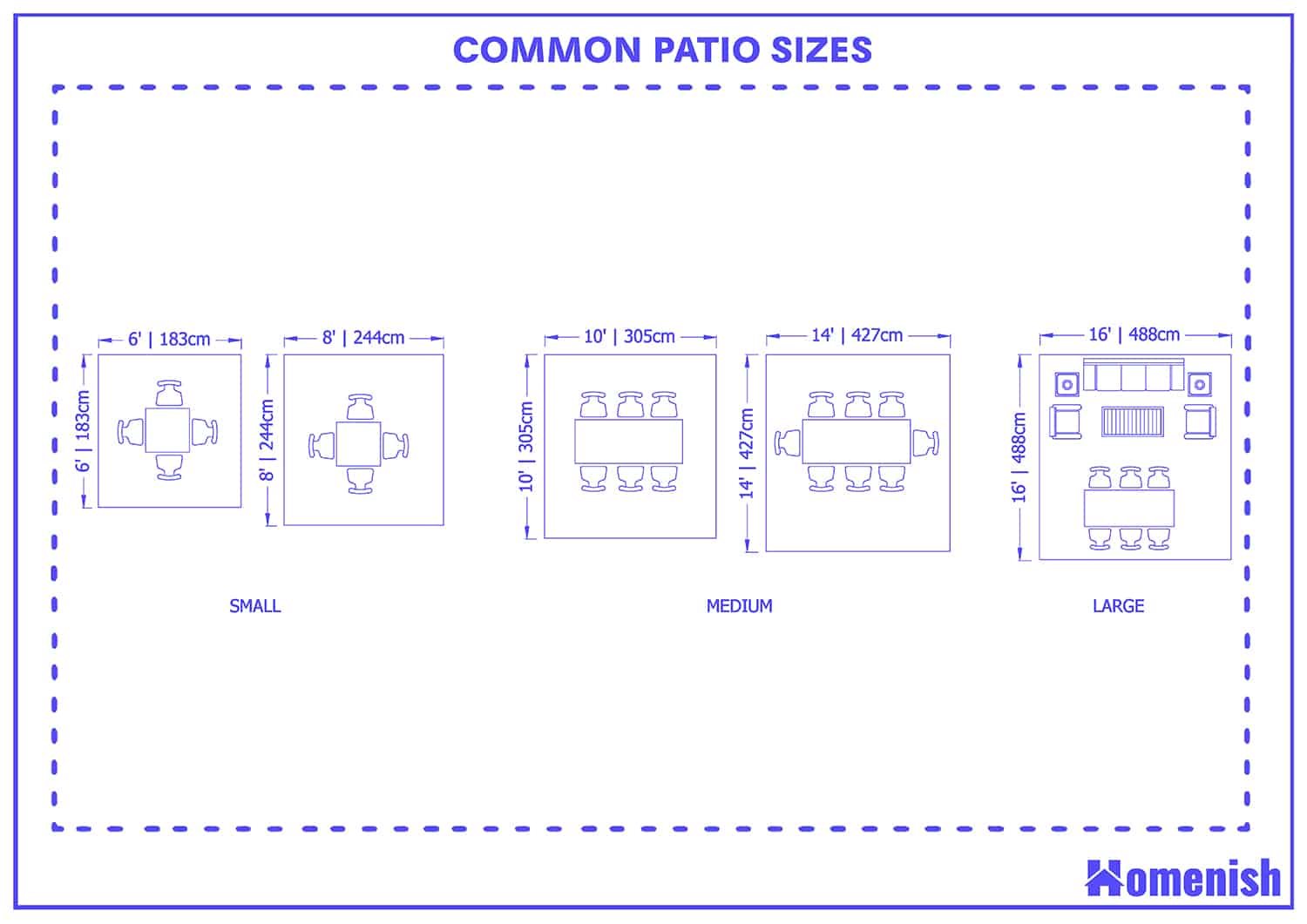A medium-size patio will be between around 10 x 10 ft and 14 x 14 feet. You can accommodate a large dining set on this type of patio, which will seat six to eight people, or an outdoor living room set.