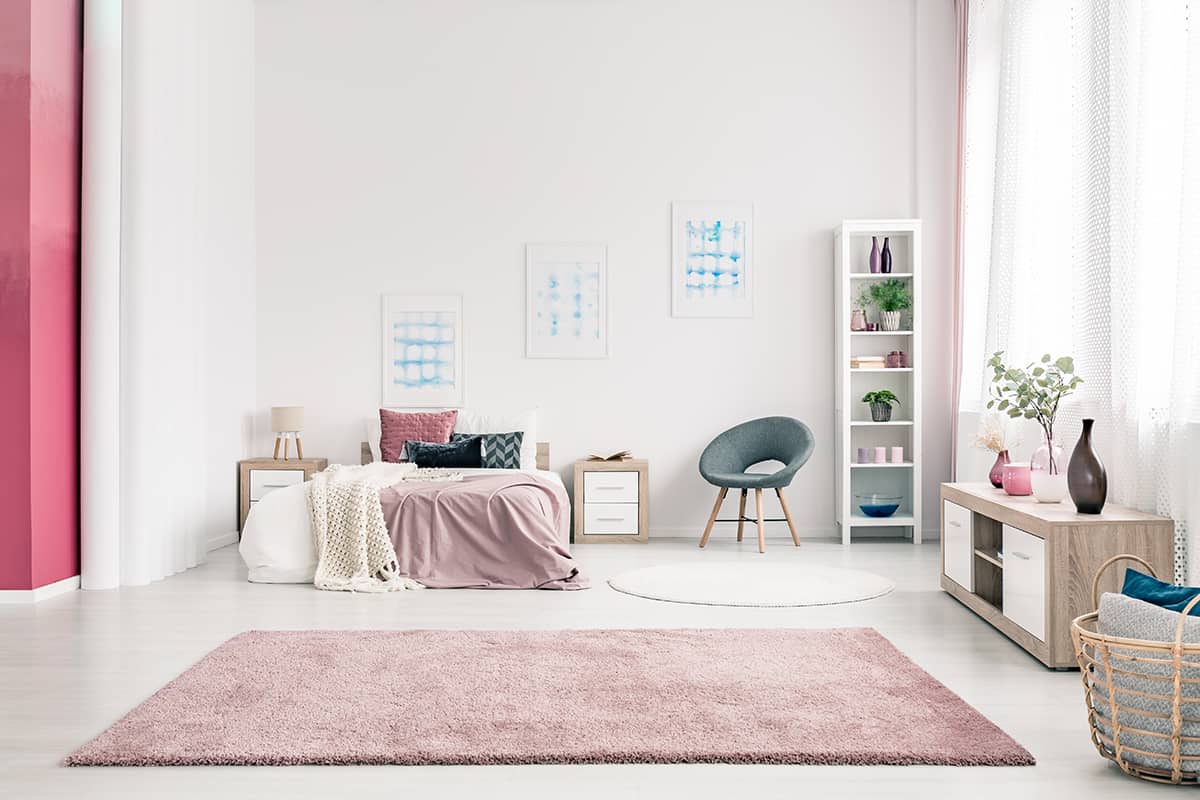 Choose a type of rug with splashes of hot pink in it rather than a solid bright pink rug, as this will result in a more designer-inspired high-end look.