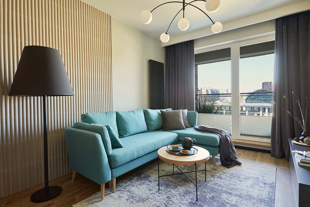 This can be avoided by adding complementary decor or accessory colors, such as green or purple in order to integrate the light blue sofa into the small living space.