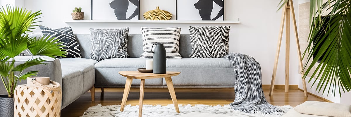 For the finishing touch, don’t forget to include complementary-colored throw pillows with your sofa. As a general rule, if your sofa is a bright and bold color, you can accentuate it with neutral or patterned throw pillows. Similarly, a neutral sofa will work very well with bold accent pillows. These little pops of color will pull the small room together and give your living space a cozier feel.