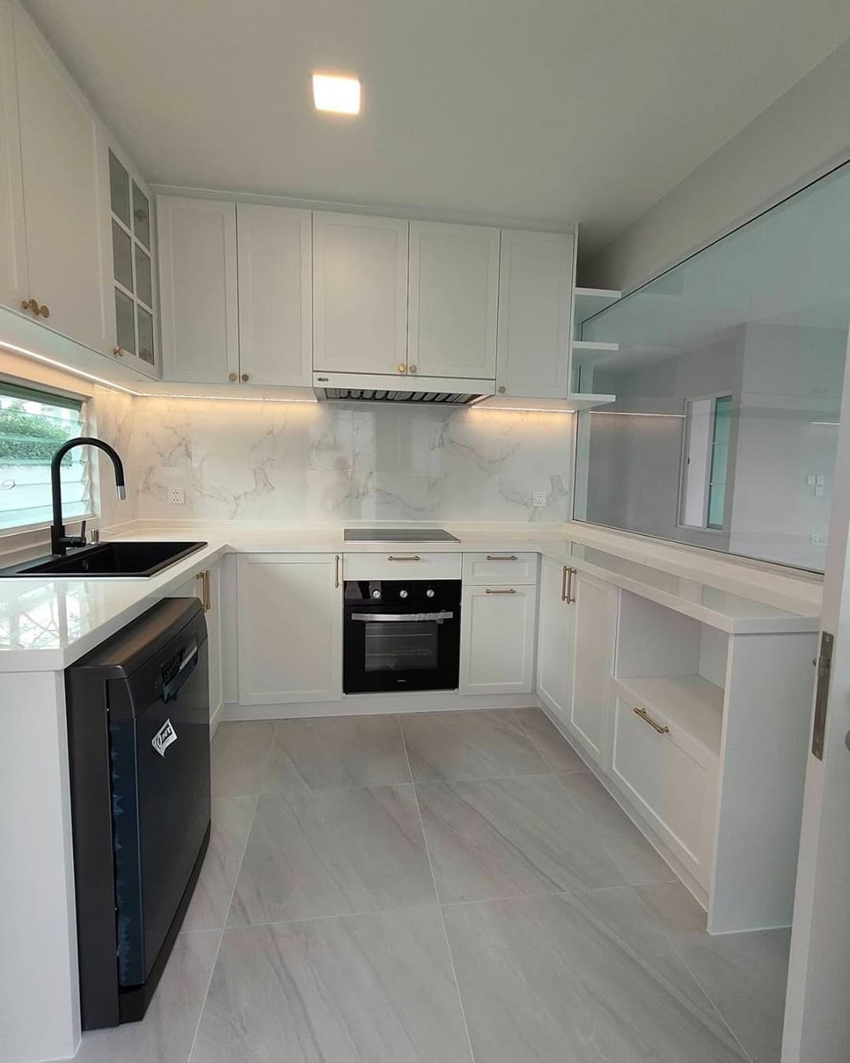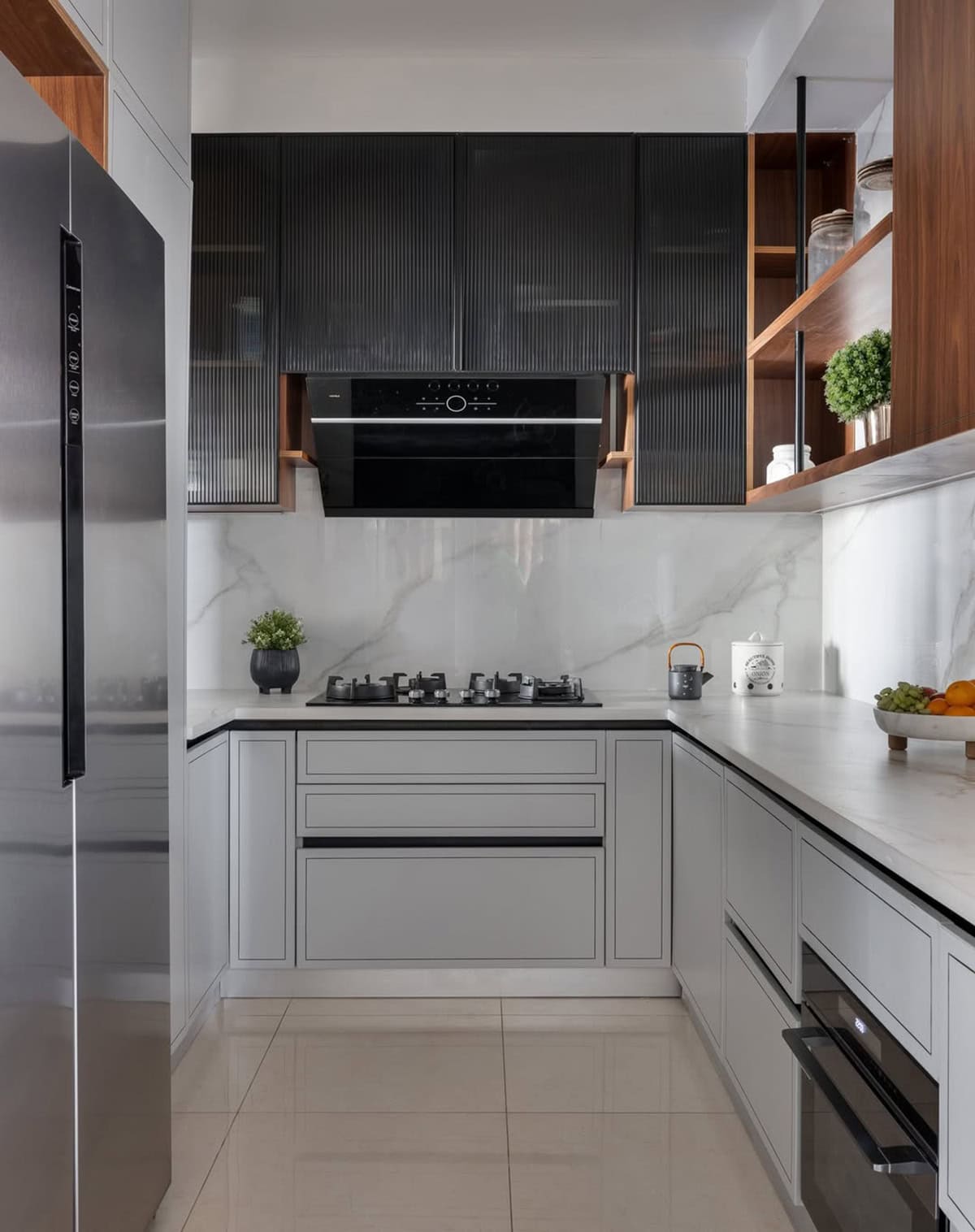Compact doesn’t mean cramped in this thoughtfully U-shaped designed kitchen. Every inch of space has been planned for efficiency, from the streamlined cabinetry to the integrated appliances. Soft lighting keeps the mood calm, and simple accents give a sense of style without clutter. This kitchen proves small spaces can still feel open and organized.
