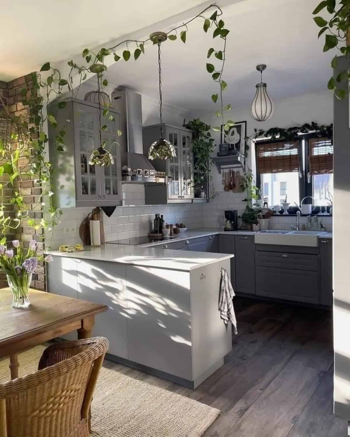 It never hurts to have an indoor plant. Or you can take it a step further and have plants everywhere. And what better place to make a bit livelier than your U-shaped kitchen? This creative homeowner designed a kitchen with lush plants hanging on the ceiling and draped over cabinets. You don’t have to go as green as this person, but you’re more than welcome!