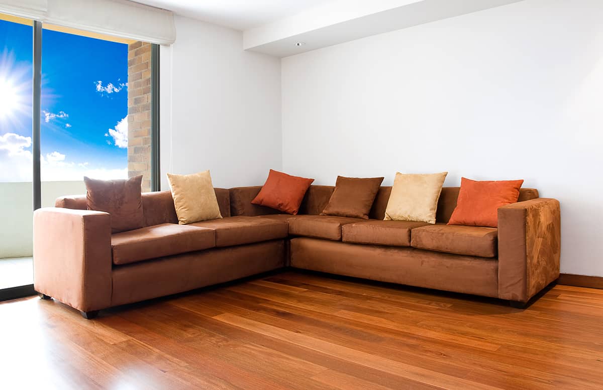 When you pair a light brown suede sofa with your cherry floor, you must think about adding brighter accessories in order to keep your room as airy and light as possible.